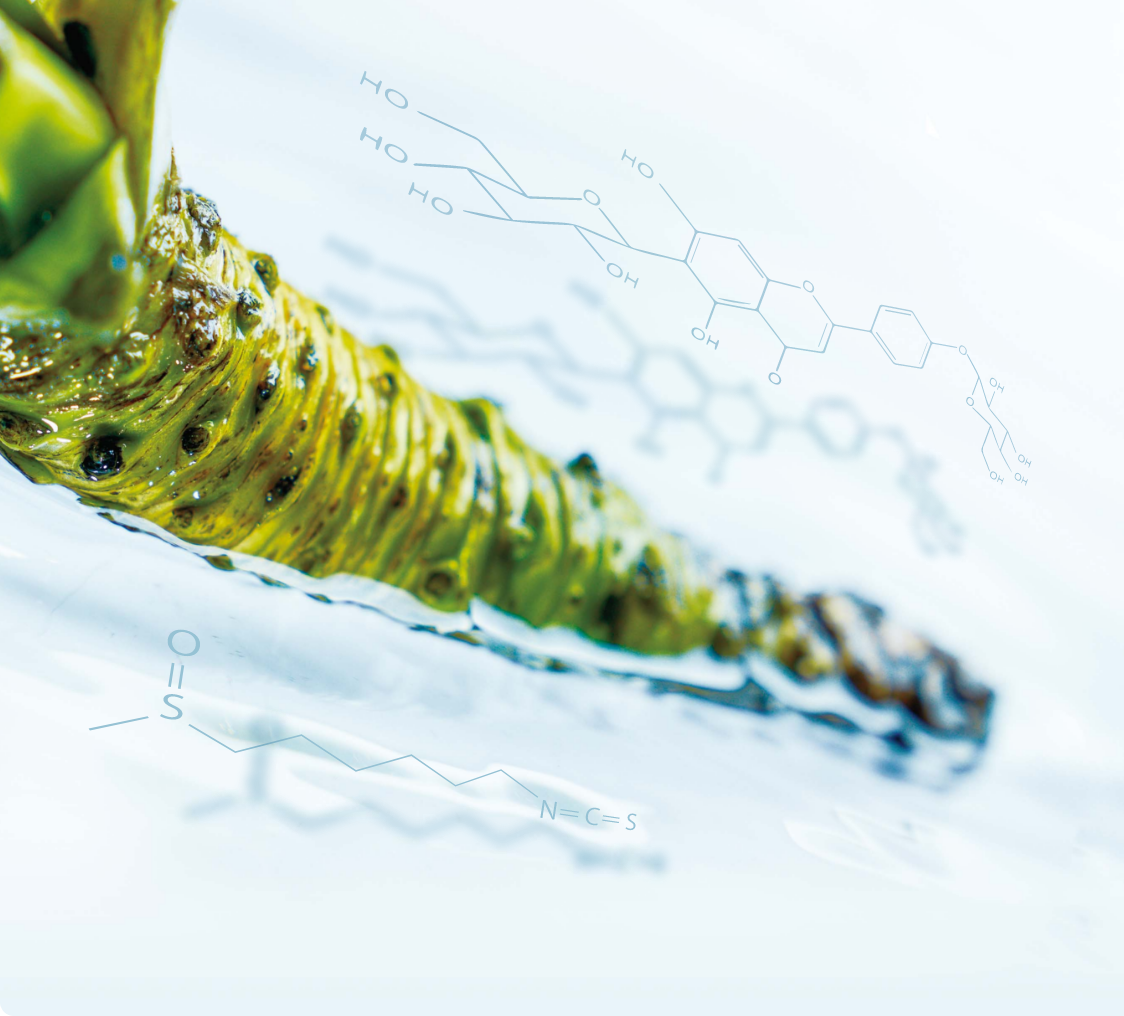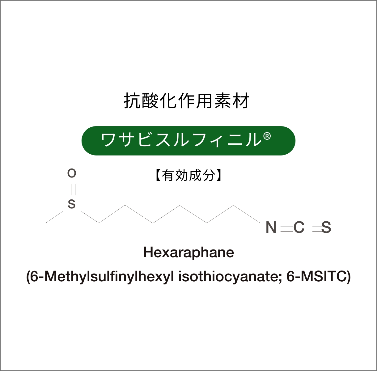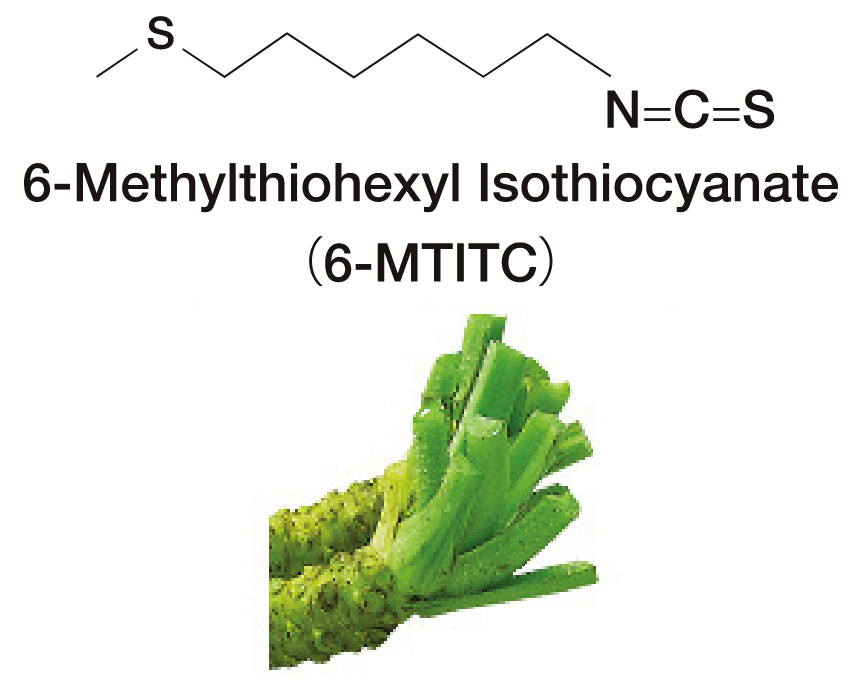 This functional ingredient is extracted from the rhizome and root of wasabi and contains hexaraphane (6-MSITC) as its active component. Hexaraphane is rarely found in the leaves or stems and only in trace amounts in the rhizome and root. Through years of joint research with academic institutions, KINJIRUSHI has uncovered various health benefits, including suppression of reactive oxygen species.