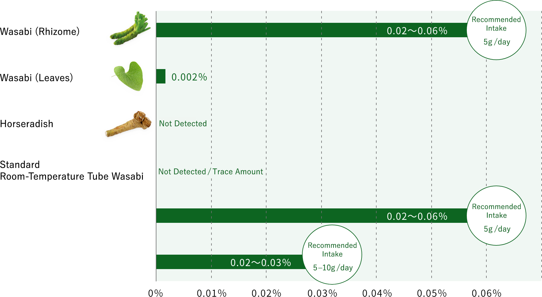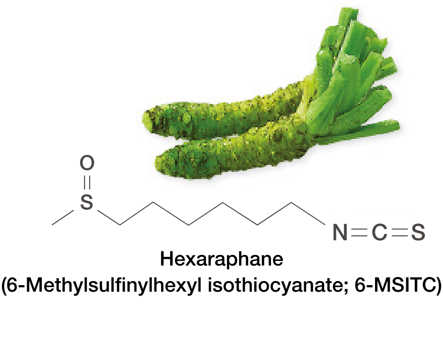 The most efficient way to consume hexaraphane (6-MSITC) is by grating fresh wasabi rhizome. In room-temperature tube wasabi, ingredients such as horseradish, preservatives, and additives are included to extend shelf life. As a result, almost no hexaraphane is present.