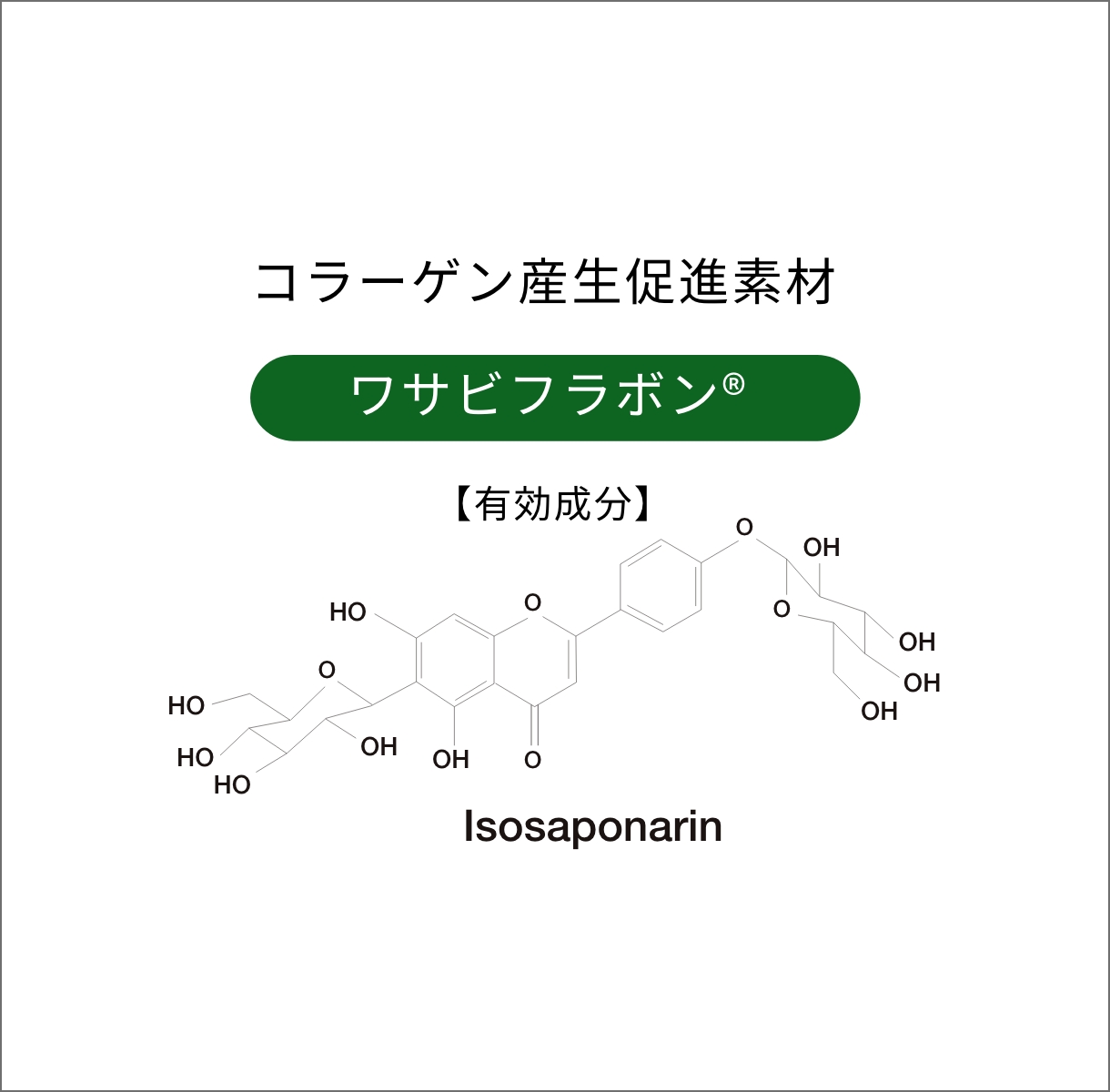 This functional ingredient is extracted from wasabi leaves and contains isosaponarin as its active component. In addition to promoting collagen production that maintains skin firmness and moisture, recent studies have confirmed its ability to suppress hair loss.