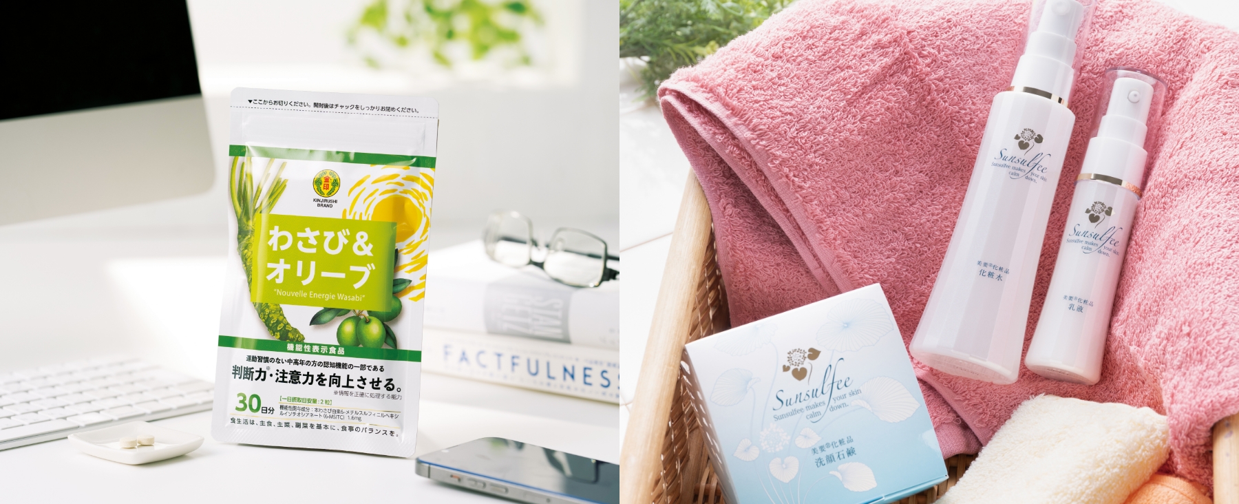 Wasabi contains a functional component called hexaraphane (6-MSITC). This is an extremely valuable ingredient found only in trace amounts in the rhizome and root. In addition to manufacturing processed wasabi products, KINJIRUSHI develops bulk ingredients extracted from wasabi's functional components and sells health and beauty products using these components.