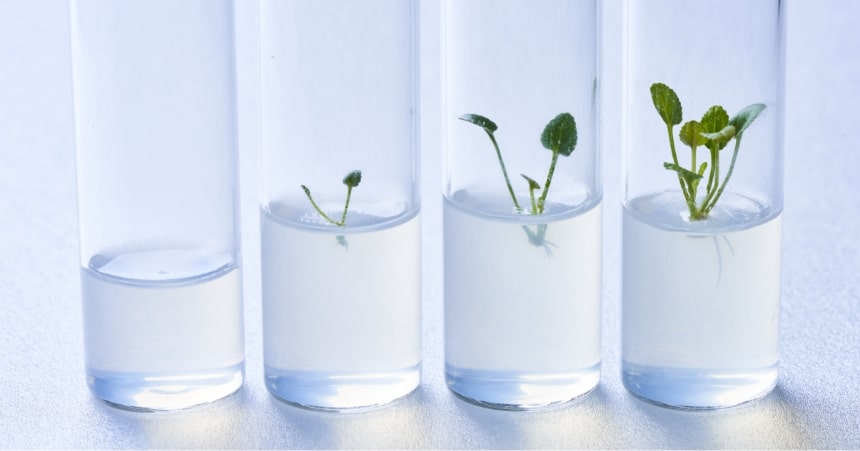 Utilizing the meristem—the plant's growth point located at the tip of roots and stems—produces seedlings resistant to disease. However, since it is tiny and located deep within the bud, each one is carefully removed by hand and cultivated in test tubes. KINJIRUSHI uses this technology to provide superior-quality seedlings of both wasabi and horseradish to contract farmers.