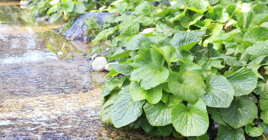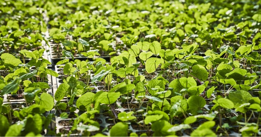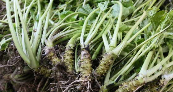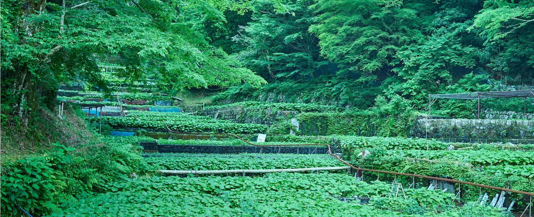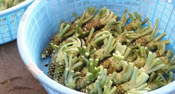 芥末种植从幼苗开始。我们从金印和静冈县采购实生幼苗,在4月至10月期间将幼苗逐步种植。到了秋季,静冈县的幼苗就供应不上了,我们便从当地采购,或是采购金印的优质生物幼苗。与稻米等不同,芥末不是一次性收获的作物,需要经过很长的时间一点点收获。近年来,温室种植条件可以维持适宜芥末生长的水温,全年都能收获、种植优质芥末。